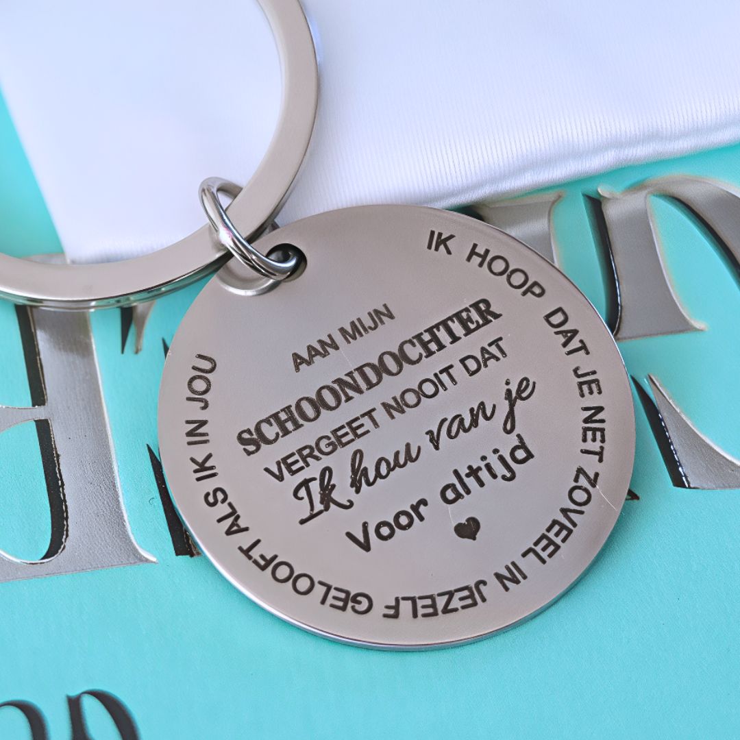 Deze betekenisvolle sleutelhanger bevat een ontroerende boodschap en de mogelijkheid om een initiaal toe te voegen, waardoor het een uniek en persoonlijk geschenk wordt. Of het nu voor een verjaardag, feestdag of zomaar is, deze sleutelhanger is een dagelijkse herinnering aan jouw liefde en steun.