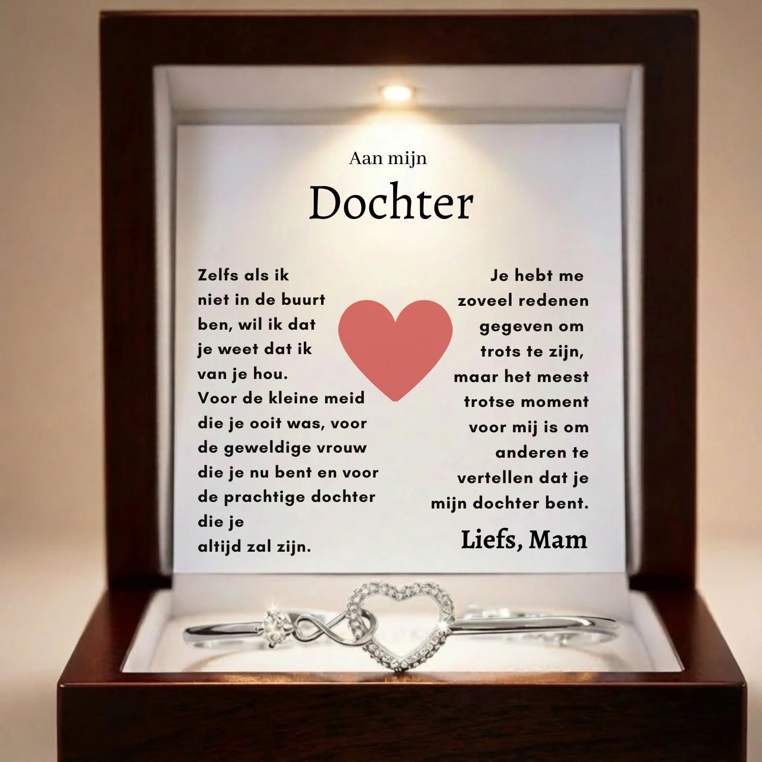 Verras je moeder of dochter met deze charmante en betekenisvolle Infinity Heart-armband. Geef haar een symbool van eeuwige liefde en toewijding, een tijdloos stuk dat spreekt zonder een woord te zeggen.